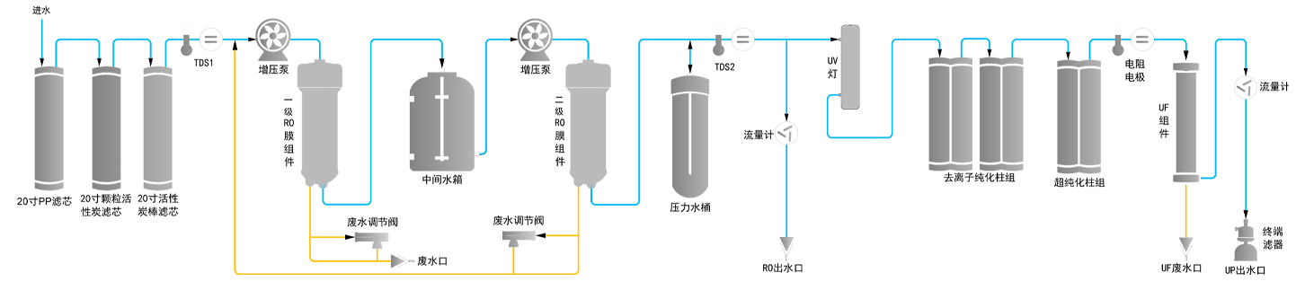 | 二級(jí)RO水 | 二級(jí)RO水離子截留率>99%(新膜),電導(dǎo)率 ≤5μs/cm; 有機(jī)物/顆粒/細(xì)菌截留率>99%;國(guó)標(biāo)三級(jí)水 | |||
