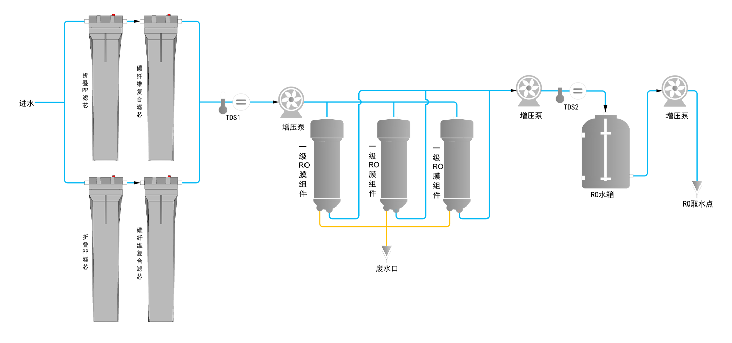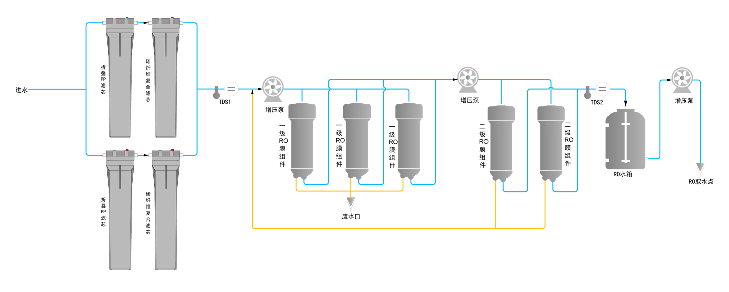 | 二級RO水 | 二級RO水離子截留率>99%(新RO膜),電導率 ≤5μs/cm; 有機物/顆粒/細菌截留率>99% | |||