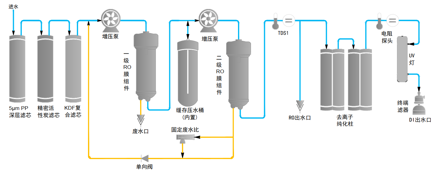 | 二級(jí)RO水 | 二級(jí)RO水離子截留率>99%(新RO膜),電導(dǎo)率 ≤5μs/cm;有機(jī)物/顆粒/細(xì)菌截留率>99%; 國(guó)標(biāo)三級(jí)水 | |