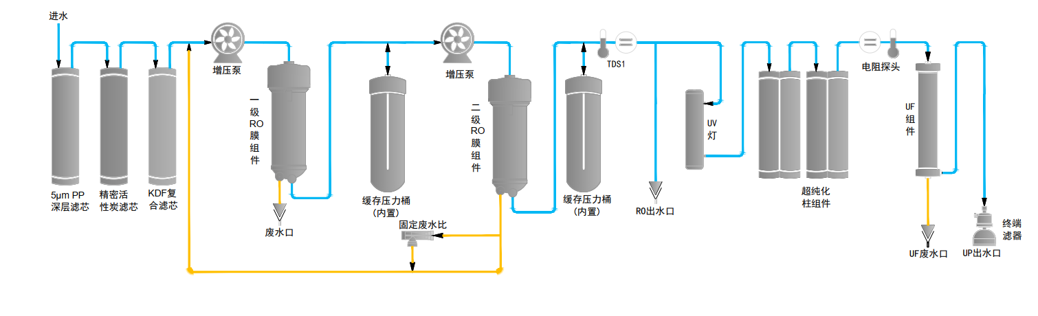 | 二級RO水 | 二級RO水離子截留率>99%(新膜),電導(dǎo)率 ≤5μs/cm; 有機(jī)物/顆粒/細(xì)菌截留率同上; 國標(biāo)三級水 | |||