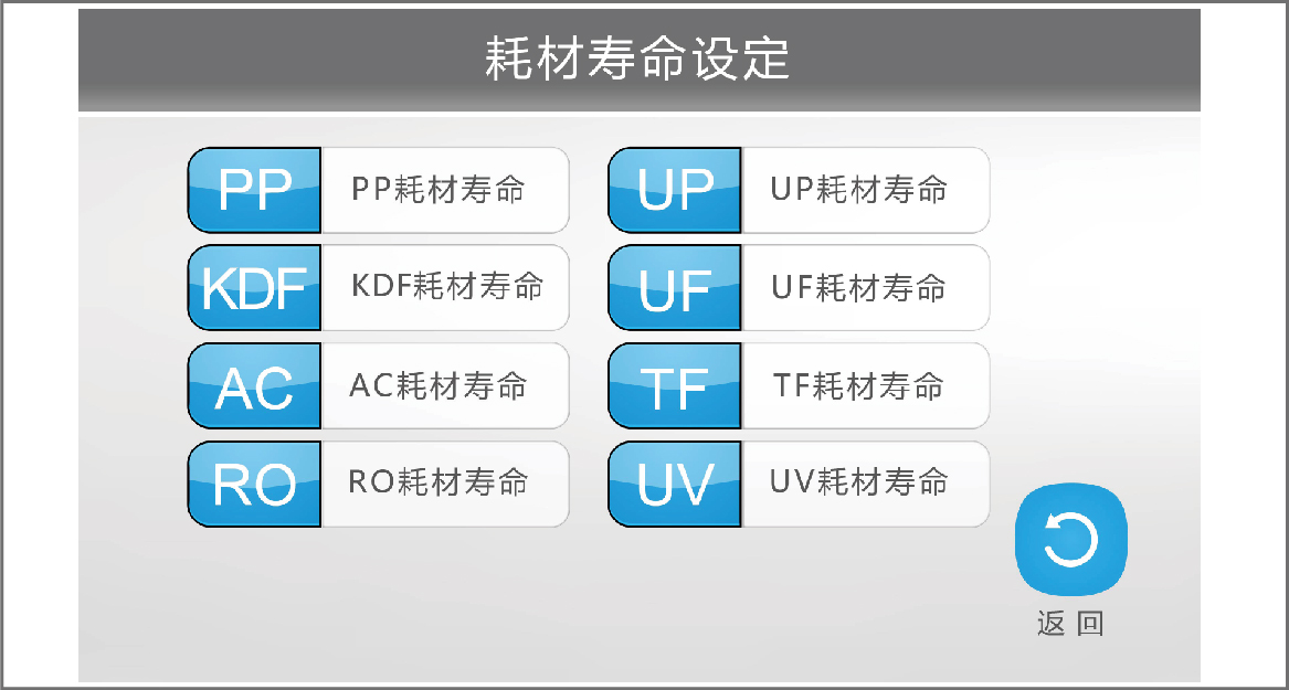 - ·PP、KDF、AC、RO、DI、UP、UV、UF、TF 耗材壽命可設(shè)定,顯示已使用時間及用量,到期自動提醒更換